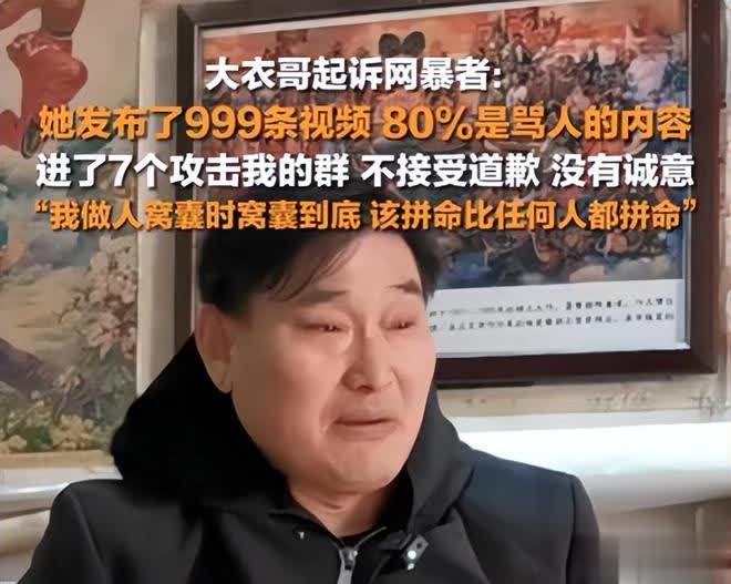 该网暴者曾发布了999条侮辱大衣哥的视频,甚至是一而再,再而三的进行这一种犯错误的行为。期间大衣哥也曾联系过施暴者,给了对方机会,但对方却仍旧我行我素,最终大衣哥无奈与他在法院进行较量。